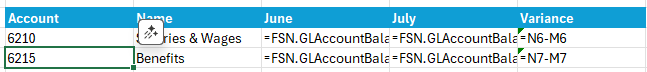 =FSN.GLAccountBalance(..., 6, "PTD", ...) - FSN.GLAccountBalance(..., 5, "PTD", ...)Two function calls in one cell. Neither can be drilled into independently. If the variance looks wrong, you can’t easily investigate which period is the culprit.