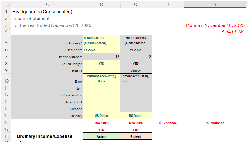 Location and Class: For a manufacturing company with multiple plants, you might want to analyze the same P&L across different locations. Now switching from Denver to “Denver (Hierarchy)” (which includes Denver and all sub-locations like Denver: Warehouse, Denver: Production Floor) requires changing a single cell.