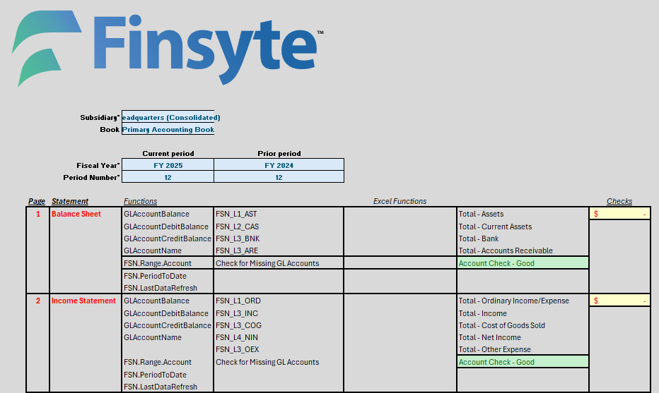 =FSN.GLAccountBalance("Manufacturing, Inc. USA", "FY 2024", 6, "YTD", "6100", 1, "", "", "Engineering", "", "")This works—until next month when you need Period 7. Or until the CFO asks for Manufacturing Europe instead. Now you’re doing find-and-replace across hundreds of cells, praying you don’t miss one.
